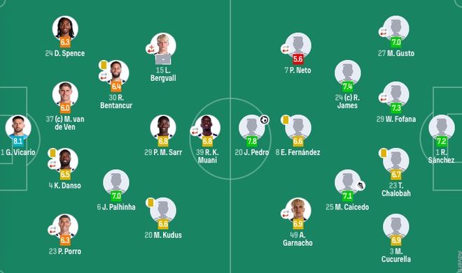 热刺首发:1-维卡里奥、4-丹索(60'17-罗梅罗)、37-范德芬、23-波罗(73'13-乌多吉)、24-斯宾塞、6-帕利尼亚、15-贝里瓦尔(7'7-哈维-西蒙斯(73'28-奥多贝尔)))、30-本坦库尔(60'9-里沙利松)、29-萨尔、20-库杜斯、39-科洛-穆阿尼(73'22-布伦南-约翰逊)